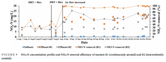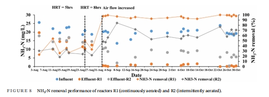 NH?-N去除率(圖8) R1達(dá)96.7%(連續(xù)曝氣),R2僅61.8%(間歇曝氣)→ 連續(xù)曝氣顯著提升硝化效率。
