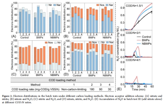 N?O積累動(dòng)態(tài) 圖2E 證明低COD:N時(shí)BMPs顯著增加N?O排放(峰值比NBMPs高15%)。