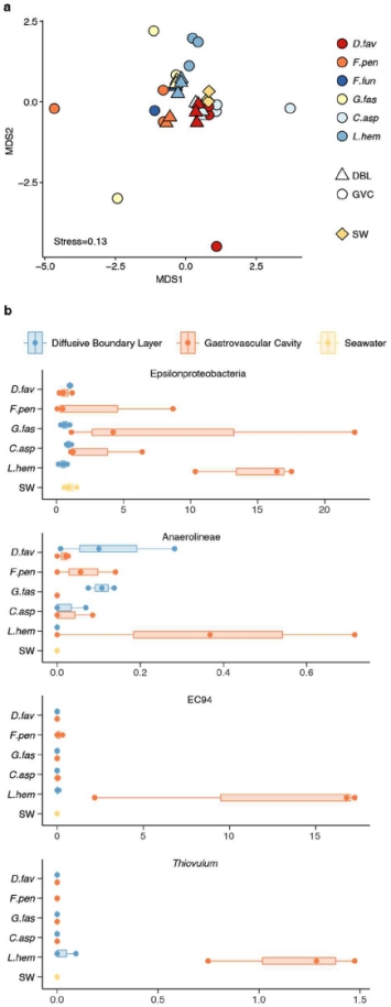 (b)突出ε-變形菌在L.hemprichii GVC特異性富集(占比>20%)。