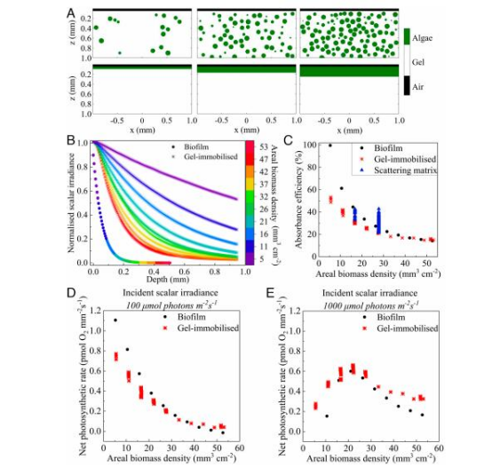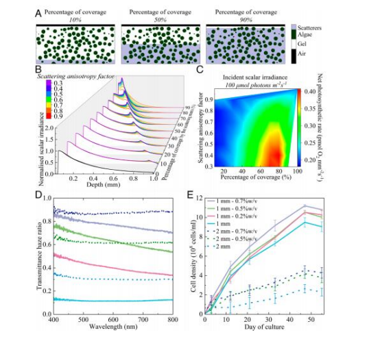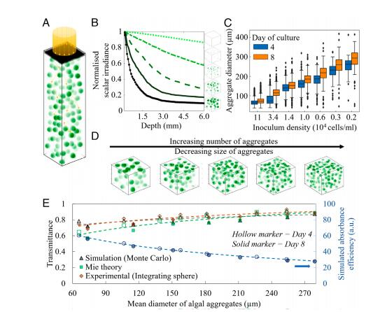 通過蒙特卡洛模擬和實驗驗證(積分球透射率測量、共聚焦顯微鏡聚集體分析),證明異質(zhì)聚集體分布比均質(zhì)生物膜更有效提升光合效率。