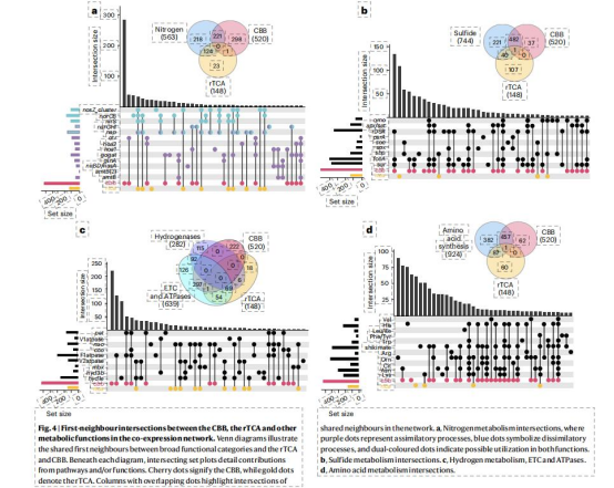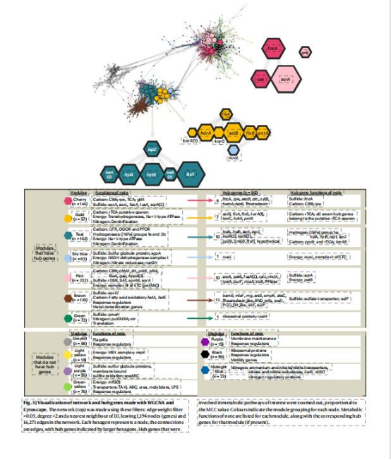 rTCA與氫化酶(Hyd1e)、異化硝酸鹽還原(norCB,nosZ)強(qiáng)關(guān)聯(lián)(金色/青綠色模塊);CBB與硫氧化(sox,fccA)、同化硝酸鹽還原(narGHI)協(xié)同(粉色/櫻桃色模塊)(Fig.5),揭示途徑特異性代謝聯(lián)盟。