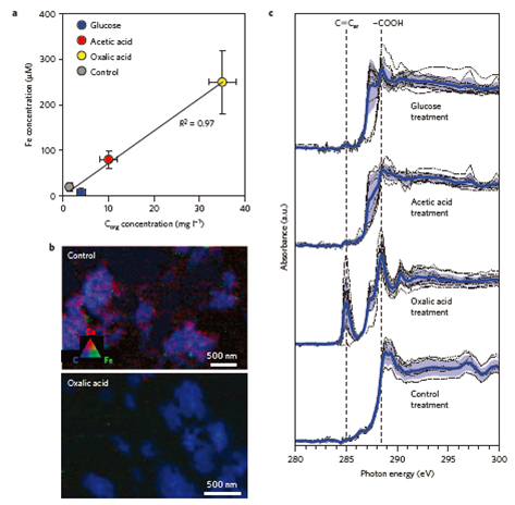 圖5、根系分泌物溶液對(duì)孔隙水中金屬-有機(jī)絡(luò)合物的影響。圖a表示的是碳在孔隙水中的移動(dòng)與溶解的鐵濃度有關(guān)。圖b表示了從對(duì)照組和草酸處理中收集的鈣和鐵與溶解有機(jī)碳有關(guān)聯(lián)。所形成的圖是在各自的吸收邊緣能量之上和之下收集的兩幅圖像掃描的差異圖。圖c表示的是孔隙水中碳的K-edge NEXAFS譜。其中感興趣的離散區(qū)域的光譜用虛線表示,藍(lán)色線和陰影區(qū)域分別表示平均值和標(biāo)準(zhǔn)差。