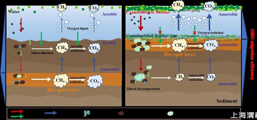 圖1藍(lán)藻衰亡改變富營(yíng)養(yǎng)化湖泊沉積物中CH4和CO2產(chǎn)生熱區(qū)的概念圖