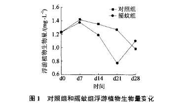 在整個培養(yǎng)期,對照組和搖蚊組上覆水浮游植物細胞數(shù)變化范圍分別為36.71萬——61.34萬個/L和30.16萬一54.86萬個/L。對照組和搖蚊組上覆水浮游植物生物量變化范圍分別為0.98mg/L——1.42mg/L和0.77mg/L——1.38mg/L。在所有統(tǒng)計中。浮游植物細胞數(shù)和生物量在對照組和搖蚊組有相同的變化趨勢(圖1、圖2)。根據(jù)細胞數(shù)和生物量的變化,對照組可以劃分為兩個階段:上升期d0一d7和下降期d14一d28,生物量最高出現(xiàn)在d7時,最低出現(xiàn)在d28時。搖蚊組變化則可以分為3個階段:上升期dO—d7、下降期d14一d2l和回升期d28,生物量最高出現(xiàn)在d7時,最低出現(xiàn)在d21時。