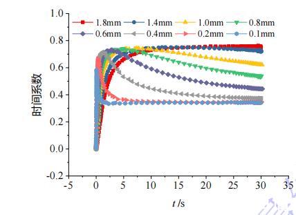 這一階段氣泡的生長受限于電極液中過飽和的溶解氧。時(shí)間系數(shù)為0.33時(shí),氣泡生長受到化學(xué)反應(yīng)控制。隨著反應(yīng)區(qū)域增大,時(shí)間系數(shù)的尖峰逐漸變大,由擴(kuò)散控制向化學(xué)反應(yīng)控制階段過渡的時(shí)間也變長。反應(yīng)區(qū)域越大,從電極擴(kuò)散進(jìn)入電解液本體的溶解氧越多。在氣泡生長時(shí),過飽和的溶解氧又從電解液本體進(jìn)入氣泡,從而導(dǎo)致時(shí)間系數(shù)更大。這與大尺寸電極中氣泡生長主要受擴(kuò)散控制的現(xiàn)象一致。