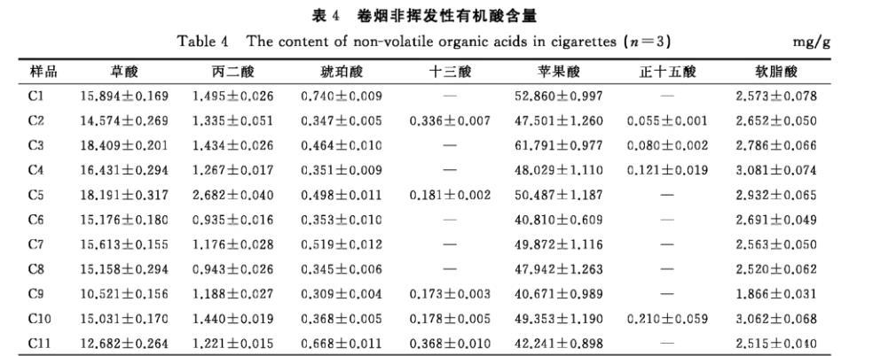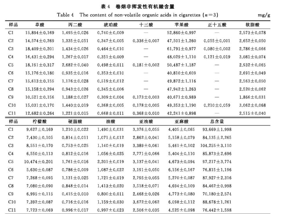 表4卷煙非揮發(fā)性有機酸含量