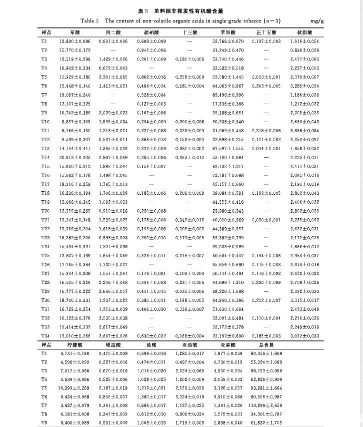 2.1.3樣品的測定卷煙非揮發(fā)性有機酸含量的測定結果見表4,單料煙非揮發(fā)性有機酸含量的測定結果見表5。