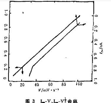 圖2為掃描速率V與峰電位的關(guān)系曲線。曲線表明,在本實驗條件下,鳥嘌呤的峰電位隨掃速的增大而向正方向移動,說明其電極反應(yīng)不可逆。