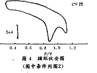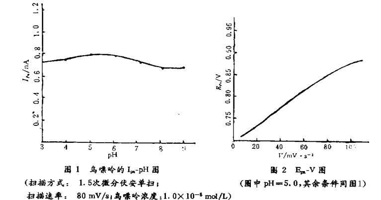 圖4是鳥嘌呤的循環(huán)伏安圖。從圖中可以看出,鳥嘌呤在實驗研究的電位范圍冉只有一個氧化峰而沒有相應(yīng)的還原峰.故其反應(yīng)為不可逆反應(yīng),且依據(jù)m=可以計算出反應(yīng)中=1.1。設(shè)a=0.5,則4=2,說明此反應(yīng)所交換的電子數(shù)為2。由前邊的討論中知=1.01~0.059 pH,綜合考慮,反應(yīng)中得失的電子數(shù)也為2。這和文獻值一致L2|。根據(jù)已有的文獻報道,嘌呤氧化后的產(chǎn)物為氧嘌呤直至尿酸伽。經(jīng)實驗驗證,尿酸在酸性的磷酸鹽介質(zhì)中在碳纖維電極上不還原。所以可以認為循環(huán)伏安圈上沒有陰極還原峰出現(xiàn),是由于鳥嘌呤的氧化產(chǎn)物在實驗的電位范圍內(nèi)不能發(fā)生還原反應(yīng)。故此氧化產(chǎn)物可能是屎酸。