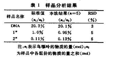 表1樣品分析結(jié)果取一定量DNA樣品(由武漢大學(xué)生物系提供,系從豬脾中獲得),在1 00℃下將其用高氯酸消化I h,然后用水稀釋,用磷酸鹽緩沖溶液調(diào)節(jié)pH值為5.0備用。準確稱取捏合樣品l和2(I為鳥嘌呤與核苷的棍合物,2為鳥嘌呤與屎注t-l表示鳥唾呤的物質(zhì)的量(IT)l為樣品中各組份的物質(zhì)的量之和(m。1)酸的棍合物。由武漢大學(xué)化學(xué)系提供)各0.050克,分別為0.05 mol/L的NaOH 10 mL溶解,然后將其分別轉(zhuǎn)移到50 mL容量瓶中,調(diào)節(jié)pH值為5.0,定制備用。取適量上述樣品溶液,按實驗方法進行了測定,其結(jié)果見襲1。
