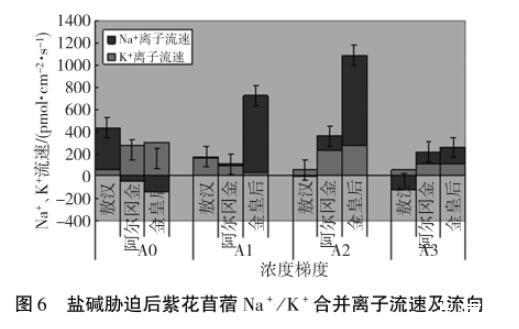 圖6鹽堿脅迫后紫花苜蓿Na+/K+合并離子流速及流向