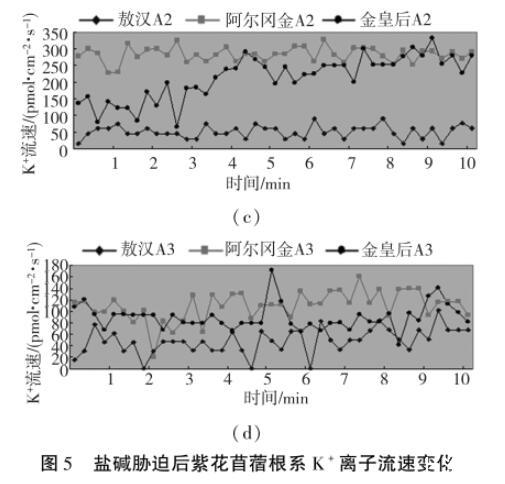 比較相同濃度下鹽堿脅迫3個品種Na+離子流速。在正常濃度下敖漢Na+離子流速表現(xiàn)為外流,最高離子流速可達875 pmol·cm-2·s-1,阿爾岡金和金皇后表現(xiàn)為內(nèi)流流速大約在256 pmol·cm-2·s-1和132 pmol·cm-2·s-1,如圖3(a);在輕度鹽堿度中3個品種基本表現(xiàn)為外流,金皇后外流速度最快,最高流速為1 400 pmol·cm-2·s-1,敖漢和阿爾岡金相對較低,如圖3(b);在中度鹽堿度下,3個品種流速變化都比較明顯,Na+外流速度都有所增加,但是阿爾岡金變化幅度最小,如圖3(c);在重度鹽堿度下,敖漢Na+開始內(nèi)流,阿爾岡金外流速度也大幅度下降,但還是表現(xiàn)為外流,而金皇后外流速度也有所減小,幅度變化不大,只有30 pmol·cm-2·s-1左右,如圖3(d)。以上結(jié)果顯示,在不同鹽堿環(huán)境下不同品種的紫花苜蓿在排鈉速度的穩(wěn)定性不同,金皇后在各個鹽堿環(huán)境下的Na+離子流速最為穩(wěn)定(重度鹽堿度除外,pH值和碳酸根濃度過高影響紫花苜蓿正常生長)。