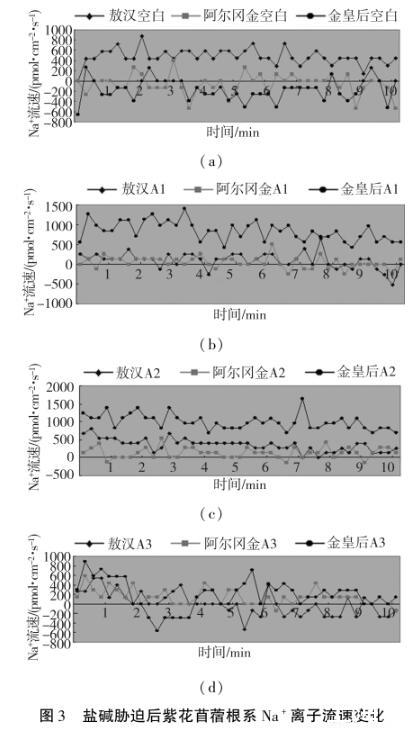 2.3鹽堿脅迫對紫花苜蓿根系Na+、K+離子流速綜合分析
