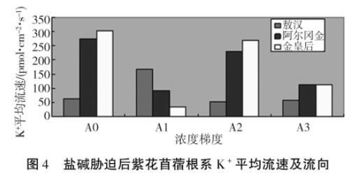 2.2鹽堿脅迫對紫花苜蓿根系K+吸收的影響
