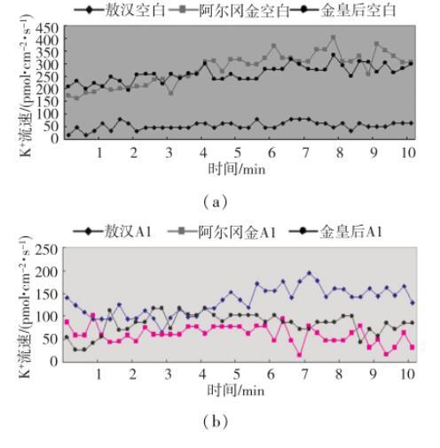 (2)耐鹽紫花苜蓿品種金皇后的Na+離子流速與中度耐鹽品種阿爾岡金類似,在輕度和中度鹽堿環(huán)境下Na+離子流速逐漸上升,在重度鹽堿環(huán)境下回落,導(dǎo)致回落的原因可能是脅迫溶液的pH值過高和高濃度的碳酸根存在有關(guān)。從總體上分析,在鹽堿脅迫下,敏感型品種敖漢Na+離子流速逐漸下降;中度耐鹽品種阿爾岡金Na+離子流速逐漸升高;耐鹽品種金皇后Na+離子流速逐漸升高,但增幅比中度耐鹽品種阿爾岡金要大。所以,紫花苜蓿在一定pH值和碳酸根濃度的鹽堿環(huán)境下,可通過控制Na+離子流速維持正常的生長。