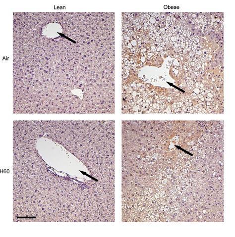 圖2用Hypoxyprobe(pimonidazole)對(duì)肝臟進(jìn)行免疫組織染色,并用蘇木精進(jìn)行反染。常氧組(空氣)和IH60組瘦小鼠和肥胖鼠的免疫組織染色具有代表性。原始放大倍數(shù):3200。缺氧區(qū)域染成棕色(pimonidazole)。箭頭標(biāo)記肝靜脈。比例尺為50毫米。