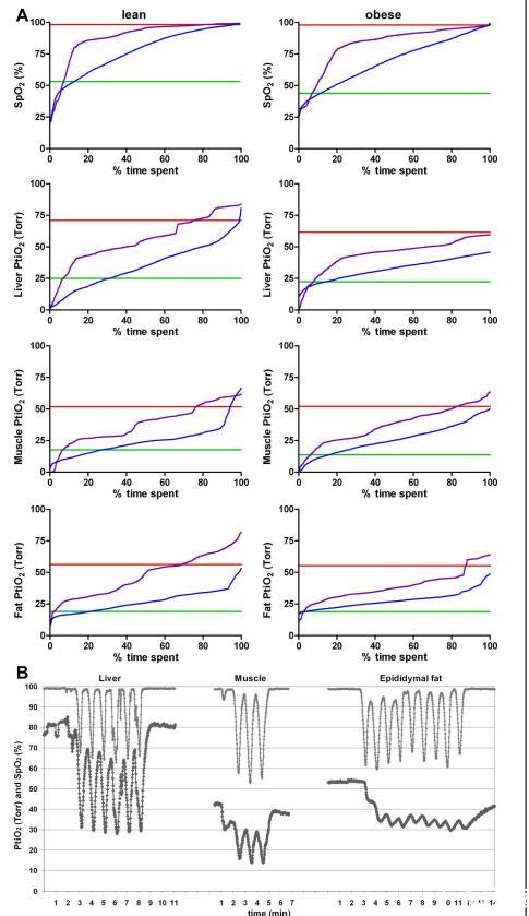 圖1 A:瘦小鼠和肥胖小鼠在正常缺氧和缺氧條件下通過脈搏血氧儀測(cè)量的血氧飽和度(SpO2)和組織氧分壓(PtiO2)的平均分布。紅色曲線表示常氧組,紫色曲線表示不頻繁的間歇性缺氧(12次/小時(shí);IH12),藍(lán)色曲線表示頻繁的間歇性缺氧(60次/小時(shí);IH60),綠色曲線表示持續(xù)缺氧(SH)。每種方案的SpO2和PtiO2值均歸一化為100%(所用時(shí)間百分比)。B:瘦小鼠頻繁間歇性缺氧時(shí)的示蹤示例。上部曲線顯示動(dòng)脈血中的SpO2,下部曲線顯示同一時(shí)間不同組織中的PtiO2。
