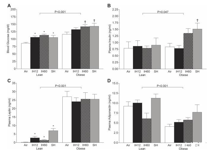 圖3不同缺氧方案和禁食12小時(shí)后的胰島素抵抗指數(shù)。A:葡萄糖。B:胰島素C:瘦素D:脂聯(lián)素。數(shù)值為平均值±SE。顯示的是常氧(空氣)、IH12、IH60和SH的數(shù)值。*與瘦空氣組相比,P<0.05。?與肥胖空氣組相比,P<0.05。
