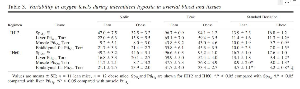 血液和所有器官的平均氧含量在常氧狀態(tài)下最高,從常氧狀態(tài)到不頻繁的間歇性缺氧(12次/小時(shí))、頻繁的間歇性缺氧(60次/小時(shí))逐漸降低,持續(xù)缺氧最低(P<0.001,圖1A,表2)。對(duì)不同組織的PtiO2進(jìn)行比較后發(fā)現(xiàn),肝臟的平均PtiO2明顯高于肌肉和脂肪(P<0.001)。在頻繁的間歇性缺氧過程中,血液和肝臟中的PtiO2出現(xiàn)高振幅波動(dòng),肌肉中的波動(dòng)較小。與SpO2相比,頻繁間歇缺氧期間肌肉和附睪脂肪中PtiO2的變異性明顯較小。在頻繁間歇缺氧期間,附睪脂肪中PtiO2的變異性最小(圖1,表3)。