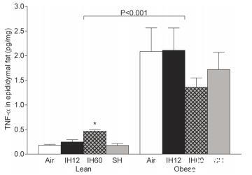 圖5不同缺氧方案后體內(nèi)外脂肪組織分泌腫瘤壞死因子-a(TNF-a)的情況。數(shù)值為平均值±SE。顯示的是常氧(空氣)、IH12、IH60和SH的數(shù)值。*P<0.05與瘦空氣組相比。