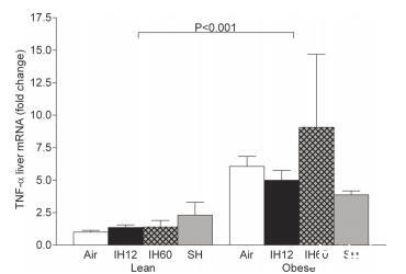 圖6肝組織中TNF-a的實(shí)時(shí)PCR檢測(cè)結(jié)果。數(shù)值為平均值±SE。TNF-a水平以mRNA表達(dá)水平表示,與18S核糖體RNA濃度進(jìn)行歸一化,然后以與瘦空氣組的比率表示。