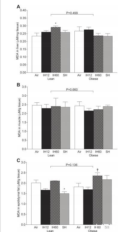 圖4通過丙二醛(MDA)水平測(cè)量不同缺氧方案后的脂質(zhì)過氧化反應(yīng)。A:肝臟。B:肌肉C:附睪脂肪。數(shù)值為平均值±SE。數(shù)值顯示的是常氧(空氣)、IH12、IH60和SH的數(shù)值。*與瘦空氣組相比,P<0.05。?與肥胖空氣組相比,P<0.05。