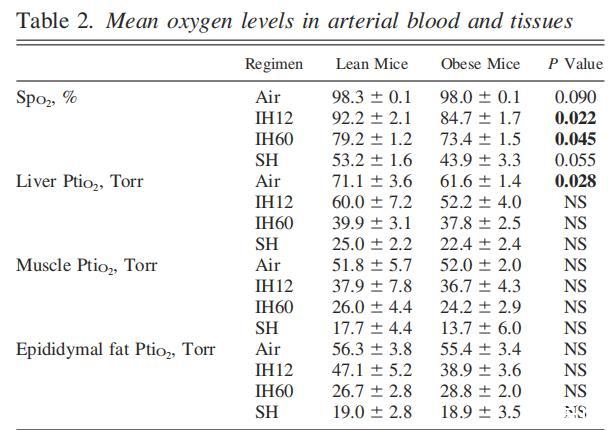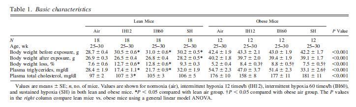 肥胖小鼠。由于預(yù)計(jì)小鼠在缺氧暴露期間體重會(huì)下降,因此有意將肥胖小鼠分組,以提高兩組間歇性缺氧暴露前的體重(表1)。暴露后,所有暴露組的體重相似。無論采用哪種缺氧方案,缺氧小鼠的體重都比對(duì)照組小鼠減輕得多。絕對(duì)體重?fù)p失與瘦小鼠相似。