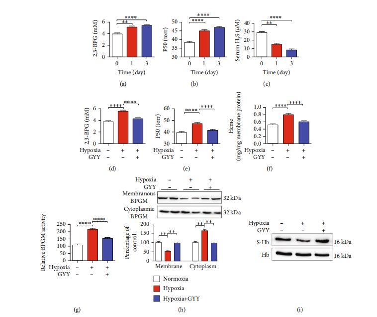 降低循環(huán)硫化氫水平有助于增加缺氧性腦損傷小鼠紅細胞中的2,3-BPG和P50水平。與先前的缺氧結(jié)果一致。研究顯示,小鼠在缺氧條件下,紅細胞2,3-BPG水平在一天內(nèi)升高,并在缺氧持續(xù)3天期間保持高水平(圖8(a))。此外,P50在缺氧一天后增加約15%,并在缺氧第三天繼續(xù)上升(圖8(b))。我們還檢測了小鼠在缺氧刺激下循環(huán)系統(tǒng)中硫化氫的水平。如圖8(c)所示,缺氧期間循環(huán)系統(tǒng)中的硫化氫水平在第一天顯著降低,并在第三天進一步減少。紅細胞、肝臟和腎臟中的CSE表達水平在缺氧期間也顯著降低。有趣的是,GYY4137處理逆轉(zhuǎn)了缺氧引起的紅細胞2,3-BPG和P50水平升高(圖8(d)和8(e))。隨后,我們測試了缺氧對紅細胞膜Hb含量、胞質(zhì)BPGM活性以及BPGM從膜到胞質(zhì)轉(zhuǎn)運的影響,以及缺氧期間硫化氫干預(yù)的效果。如預(yù)期,與正常氧環(huán)境下的小鼠相比,缺氧暴露組小鼠的紅細胞中血紅素含量顯著升高(圖8(f))。與此一致的是,缺氧組小鼠紅細胞的胞質(zhì)BPGM活性顯著增強(圖8(g)),而膜BPGM水平顯著降低,胞質(zhì)BPGM水平則顯著升高(圖8(h))。在缺氧條件下,GYY4137處理可降低紅細胞膜血紅素含量,同時提升胞質(zhì)BPGM活性和膜BPGM水平,降低胞質(zhì)BPGM水平(圖8(f)–8(h))。此外,缺氧組小鼠的血紅蛋白硫水合水平降低,而GYY4137處理可逆轉(zhuǎn)這一現(xiàn)象(圖8(i))。