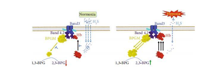 圖9:硫化氫在常氧和缺氧條件下調(diào)節(jié)2,3-BPG和Hb-O2結(jié)合親和力的潛在機制整合方案。硫化氫抑制Hb從細胞質(zhì)向膜的轉(zhuǎn)運,進而促進BPGM錨定于膜上,從而防止常氧條件下2,3-BPG水平的升高。在缺氧期間,硫化氫水平的降低促進了Hb錨定于膜上,并促使BPGM從膜上釋放到細胞質(zhì)中,最終導(dǎo)致紅細胞中2,3-BPG生成的增加。