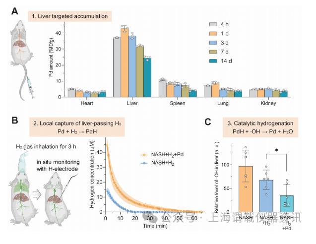 圖3、Pd納米顆粒在NASH模型中的肝臟靶向積累、局部氫捕獲和催化氫化行為。靜脈注射后Pd納米顆粒的生物分布和肝內(nèi)滯留(A),通過氫電極實(shí)時(shí)原位監(jiān)測NASH小鼠注射Pd和3小時(shí)氫氣吸入后肝臟中的氫濃度(n=6)(B),Pd納米顆粒催化氫化清除NASH小鼠肝臟中·OH的能力(C)。