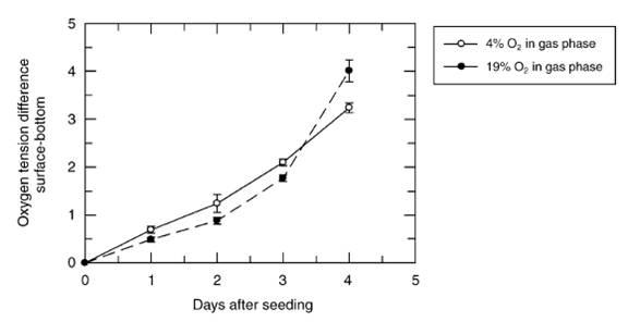 圖5、表面底部氧分壓差值對(duì)應(yīng)5×105細(xì)胞/培養(yǎng)皿接種時(shí)間的函數(shù)圖。第7天培養(yǎng)時(shí),細(xì)胞周圍的氧分壓低于缺氧呼吸水平(1.3%)。開放的圓圈表示細(xì)胞在含4%氧氣的環(huán)境中生長,封閉的圓圈表示含19%氧氣的環(huán)境中生長。
